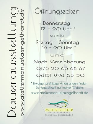 ZURÜCK IN MÜNCHEN! Nach dreieinhalb Jahren am Starnberger See ist mein Atelier "ArtBoxStarnberg" in der Hauptstraße 23, Starnberg, Geschichte. Meine energiegeladene Kunst und ich sind seit dem 1. Oktober 2018 wieder komplett zurück an die Isar gezogen und nun im Herzen Münchens zu finden! Auch wenn ich hier aktuell keine regelmäßigen Öffnungszeiten anbieten kann, sind Sie jederzeit in meinem neuen Kunstdomizil in der Nähe des Kapuzinerplatzes nach Vereinbarung willkommen. Setzen Sie...