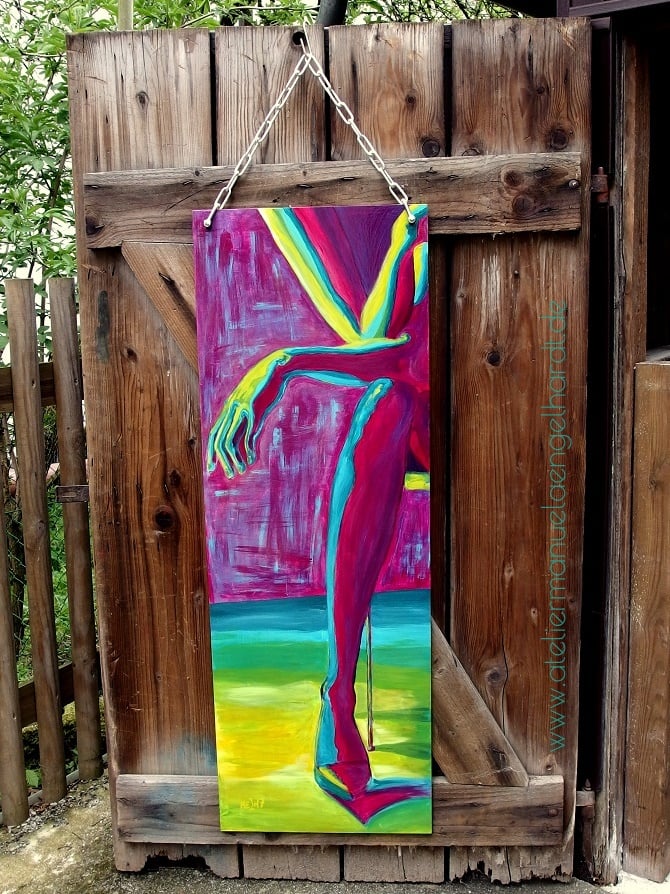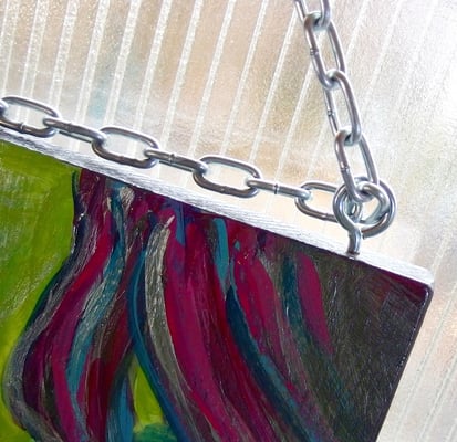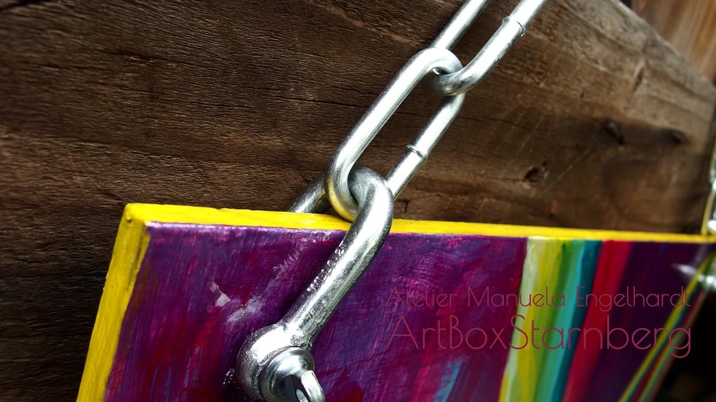 Acryl auf Holz, 2017, einseitig bemalt mit Kettenaufhängung.