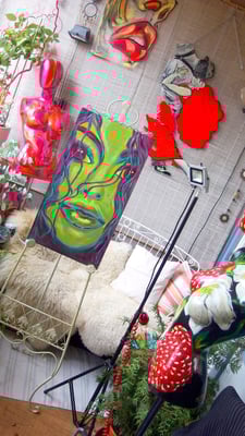 Sinnliches Gesicht in Acryl auf Holzplatte mit cooler Kettenaufhängung. Die Oberfläche wurde versiegelt, so dass es stoßfest ist und auch feucht gereinigt werden kann.