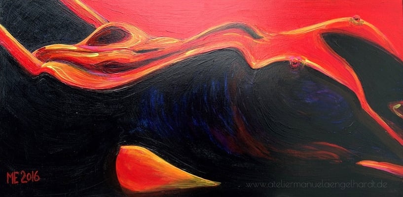 Sinnlich anmutendes Acrylgemälde, das ein wunderbares Spannungsverhältnis zwischen warmen und kalten Farben, zwischen Nähe und Distanz bietet.